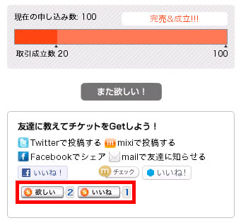 Sorevoでは決められた時間内に一定の購入希望者が集った場合のみ、商品化して販売するというサービスの特性を踏まえ、口コミ誘発を目的として、商品詳細ページへFacebook、mixi、Twitter、GREEなどのソーシャルメディアへの投稿ボタンを設置していました。