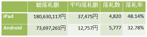 平均落札額についてはiPadがAndroidのおよそ3倍という結果になり、また落札率についても15.36%高く、iPadの人気がうかがえる結果となりました。