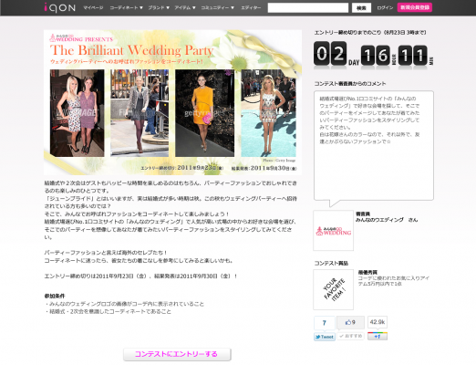 株式会社VASILY(本社:東京都渋谷区 代表取締役:金山裕樹 http://vasily.jp)が運営するソーシャルファッションサイト『iQON』(アイコン、http://www.iqon.jp)は、株式会社みんなのウェディング(本社:東京都中央区、代表取締役:飯尾慶介)が運営する結婚式場選びNo.1口コミサイト「みんなのウェディング」※と結婚式お呼ばれコーディネートをテーマとしたファッションコーディネートコンテストを開催します。