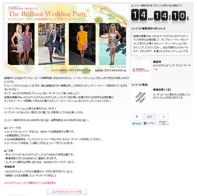 結婚式場選びNo.1口コミサイト「みんなのウェディング」※(http://www.mwed.jp/)を運営する株式会社みんなのウェディング(本社:東京都中央区、代表取締役:飯尾慶介)は、株式会社VASILY(本社:東京都渋谷区、代表取締役:金山裕樹)が運営する、ソーシャルファッションサイト「iQON」(アイコン、http://www.iqon.jp)と結婚式お呼ばれコーディネートをテーマとしたファッションコーディネートコンテストを開催します。