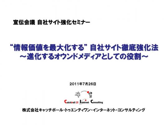 (株)キャッチボール・トゥエンティワン・インターネット・コンサルティング(東京都千代田区、03-3237-1367)の専務取締役原田慎太郎は、2011年7月26日(火)に開催された「自社サイト強化セミナー」にてセミナー講演いたしました。