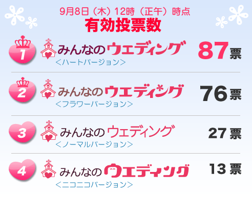 スマートフォン対応に合わせ、サイト名を読みやすくするため、カタカナロゴを4パターン(ノーマルバージョン、ハートバージョン、フラワーバージョン、ニコニコバージョン)制作し、ソーシャルな口コミサイト「みんなのウェディング」らしく“みんな”に決めていただくという新しい試みを行いました。