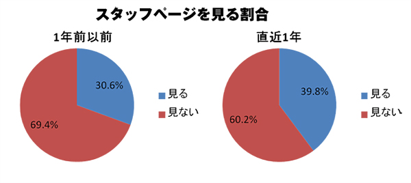 いえらぶでお問い合わせをしていただいたユーザー約1000人に実施したアンケートにて、「不動産会社のスタッフページを見る?」という質問に対する回答の約33%が「見る」という回答でした。このデータを直近1年とそれ以前のものとを比較すると、約10%もスタッフページを見ると回答したユーザーは増加していることがわかりました。