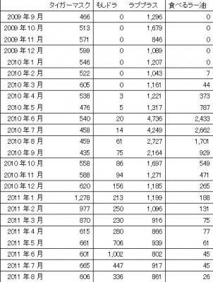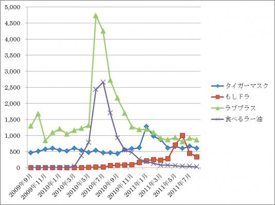 タイガーマスク、もしドラ、ラブプラス、食べるラー油の4点の落札数動向を調査いたしました。