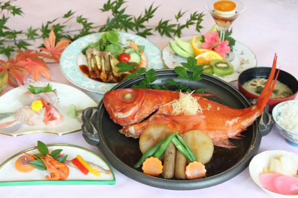 =(新メニュー例)前菜、刺身、台物(金目鯛の姿煮)、焼物、ご飯類、デザート