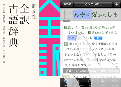 さらに、明朝体フォントには高品質な字游工房社の「游明朝体 R(専用版)」を搭載し、用例や一部の見出で使用しています。明朝体を搭載していない iPhone / iPod touchでも雰囲気のある表示が実現されています。