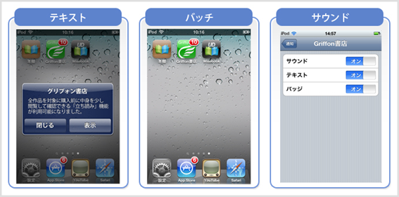 同社では、自社運営のiOSアプリ書店「グリフォン書店」にプッシュ通知機能を実装し、サービスを提供しています。