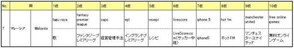 「無料オンラインゲーム」や「iPhone5」など、他国でも急上昇しているキーワードが挙がっています。一方で、サッカー関連、特にイングランドプレミアリーグに関するキーワードが上位を占めているのが特徴です。またサッカー中継のWebサイトが検索されていることから、Webサイトからサッカーやスポーツの情報を収集することが一般的になっていると想定されます。