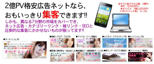 おもいっきり集客できる。しかも違う7分野の市場をカバー、インターネット広告、モバイル広告、被リンクSEO対策と圧倒的集客にかかせないものがそろっています。インターネット広告、モバイル広告限定5社半額オーディション系ネットショップ系芸能プロダクション系用20サイト(1サイト平均1600円)で掲載できる。