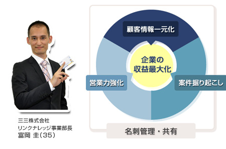 「名刺管理・共有」をベースに「顧客情報一元管理」「案件掘り起こし」「営業力強化」を実現することにより、企業の収益を最大化させます。
