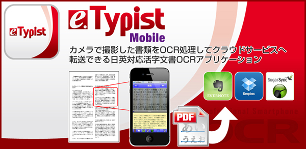 「e.Typist Mobile」は、紙情報をデジタル化する作業をスマートフォンで実現したアプリケーションです。カメラで撮影した新聞や書籍、雑誌、資料等の活字文書をOCR処理※1し、テキストデータに変換します。パソコン用OCRアプリケーションで実績のあるOCRエンジンを搭載しておりますので高精度なOCR処理が可能です。