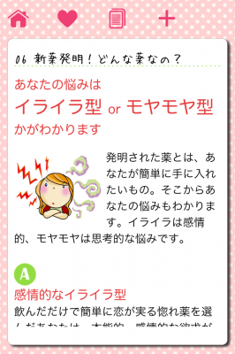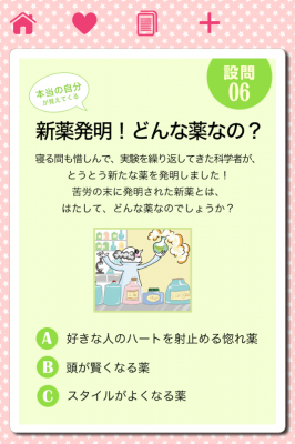 カードの表に設問、タップして裏をめくると診断というカードブック形式
