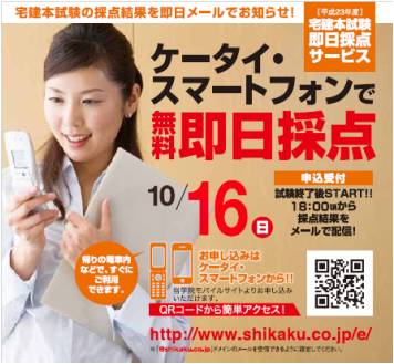 「宅建試験 即日採点サービス」とは、総合資格学院が毎年実施している宅建試験の無料採点サービスです。ケータイ電話、スマートフォン、パソコン等からご自身の解答番号を入力していただければ、当日のうちに採点結果をメールでお知らせします。