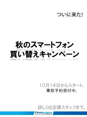 全国23店舗及びウェブ通販のパソコンショップ『ドスパラ』を運営する株式会社サードウェーブ(代表取締役 : 尾崎健介、本社 : 東京都千代田区)は、2011年10月14日(金)より、ドスパラ全店舗において、「秋のスマートフォン買い替えキャンペーン」を実施いたします。