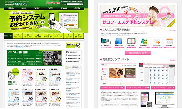 トップページのナビゲーションに、業種別のアイコンを設置し、業種ごとのページへリンクしやすいように変更いたしました。また、各業種のサイトでは、サンプルサイトをご用意し、システムをより分かりやすくご紹介しています。