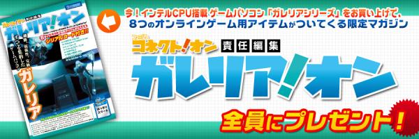 全国23店舗及びウェブ通販のパソコンショップ『ドスパラ』を運営する株式会社サードウェーブ(代表取締役 : 尾崎健介、本社 : 東京都千代田区)は、2011年10月20日より、インテル製CPUを搭載したゲームパソコン「ガレリア」シリーズをお買い上げのお客様全員に、8タイトルのゲーム特典が付属する小冊子『ガレリア!オン』をプレゼントいたします。