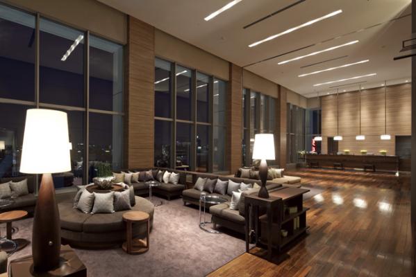 ▲市街地を見下ろす13階のスカイフロントとラウンジ