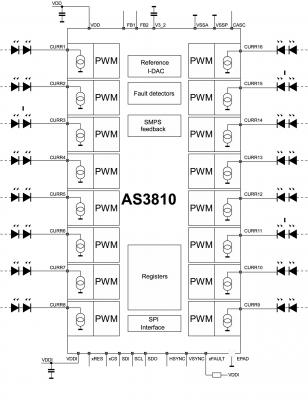 FET内蔵の16チャネルLEDドライバ AS3810は、直下型テレビ向け第3世代ドライバICです。AS3810は、業界最高レベルのチャネル間電流精度を特長とし、直下型照明の大型テレビの電力効率を最適にする全ての機能を搭載しています。AS3810では、多数のバックライトセグメントを動的に調光するための複数ICの接続を簡単に実現できます。消費電力をさらに削減しながら、最高のコントラストを完全に支援します。このドライバICポートフォリオは、最高の光均一性実現のための最高の電流精度を要求する全てのテレビシステムの設計に合致します。また、このデバイスは、最新の3D機能を支援すると共に、システムコストの削減にも寄与します。