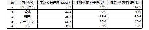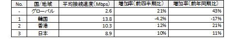 世界各国の平均接続速度ランキングでは、1位韓国(13.8Mbps)、2位香港(10.3Mbps)、3位日本(8.9Mbps)と、前四半期と同じく、アジア太平洋地域の3カ国がトップ3を占めています。