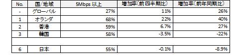 国別での5 Mbps以上の高速ブロードバンド接続の利用率については、香港(59%)、韓国(58%)、日本(55%)、が世界ランキングの上位を占めています。