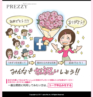 2011年10月27日、株式会社spice life(所在地:東京都渋谷区桜丘町13-1 代表取締役:吉川保男)は、ソーシャルメディアを使って誕生日祝いに友だちとみんなで花束を贈ることが出来る世界初のソーシャルフラワーギフトサービスPREZZYのクローズドベータ運用をスタートしました。