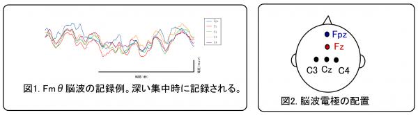 図1:Fmθ脳波の記録例。深い集中時に記録される。 図2:脳波電極の配置イメージ。