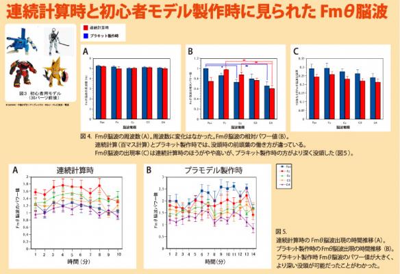 ・Fmθ脳波の出現率 (図4C)は連続計算時の方がやや高いが、プラキット製作時の方がより深く没頭していた(図5)。