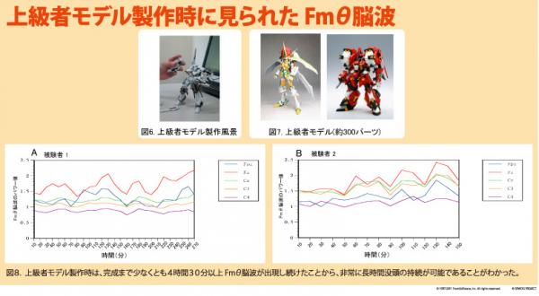 ・上級者モデル製作時は、完成まで少なくとも4時間30分以上Fmθ脳波が出現し続けたことから、非常に長時間没頭を持続可能なことがわかった。