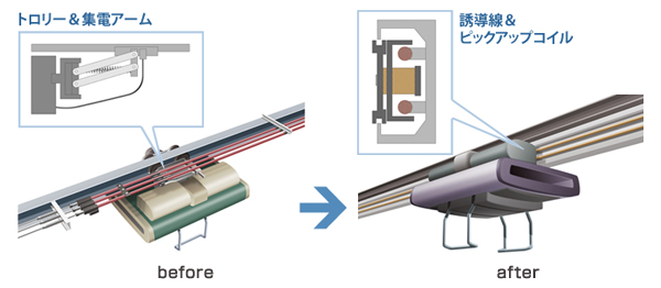 電磁誘導の作用を応用した非接触給電システムです。自走する移動体などに集電子(金属接点)なしで高効率に電力伝達できるのが特徴で、(株)ダイフクで累計7000台の納入実績を誇ります。集電子がないため、ほこりや汚れが付着して接触不良を起こしたり、漏電やショートが発生したりする心配がなく安心安全にご利用いただけます。また、集電子による粉塵の発生や、集電子自体の磨耗がないため、クリーンな環境を保つことができ、半導体や製薬、食品関連などのクリーンルーム、異物の混入が許されない現場、水中や水回りで漏電が懸念される現場での電気設備への給電、移動体への給電などの用途に適しています。また、感熱線により異常を検出し給電を安全に停止させる機能を持っているのも大きな特徴です。