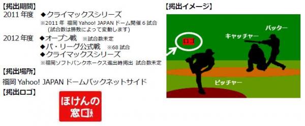 当社は「すべての方に、最適な保険を」という思いから、これまで多くのイベントやスポンサー活動を展開し「来店型保険ショップ」の認知度向上に尽力して参りました。その一環として、全国3球場への看板掲出、フィギュアスケート「Japan Open 2011」や、ゴルフトーナメントへの協賛などを行ってまいりましたが、このたび「ほけんの窓口」グループ6 店舗を置く福岡県から全国へ発信を図り、野球ゲーム中継中にテレビ画面中央に映し出されるバックネットサイド広告の掲出を決定いたしました。