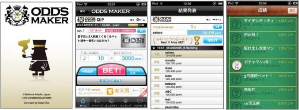 株式会社アイ・エム・ジェイ(JASDAQ 4305)グループの株式会社ボトルキューブ(本社:東京都目黒区、代表取締役社長:川口 達也)は、株式会社ベルロックメディア(本社:東京都新宿区、代表取締役:中多 広志、以下ベルロックメディア)と株式会社ディーツー コミュニケーションズ(本社:東京都港区、代表取締役社長:宝珠山 卓志、以下D2C)がiPhoneTM向けに提供開始したクイズゲームアプリ「ODDS MAKER(オッズ・メーカー)」を開発しました。「ODDS MAKER」は、2011年11月11日(金)よりApp Storeにて配信開始いたします。