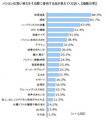 パソコンの買い替えをする際に重視する点について質問したところ、処理速度(84.9%)が第1位となりました。