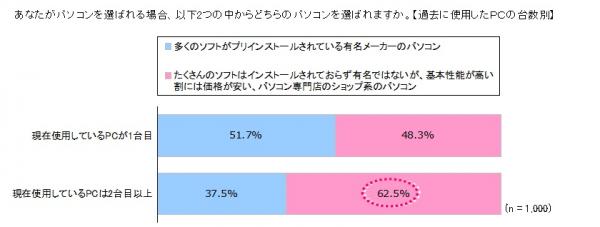「多くのソフトがプリインストールされている有名メーカーのパソコン」(以下、有名メーカーのパソコン)と「たくさんのソフトはインストールされておらず有名ではないが、基本性能が高い割には価格が安い、パソコン専門店のショップ系のパソコン」(以下、ショップ系のパソコン)どちらのPCを購入したいかを質問したところ、現在使用しているパソコンが1台目のユーザーの場合、「有名メーカーのパソコン」を選ぶ人が多いものの、2台目以降のユーザーは「ショップ系のパソコン」を選ぶ人が多くなることがわかりました。特に買い替えが5台目以上のヘビーユーザーについては、7割以上がショップ系のパソコンを希望しており、パソコンを使いこなすほどに、ユーザーはよりシンプルなマシンを求める傾向にあることがわかります。
