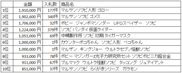 この度弊社では「ソフビ」キーワードを含む高額落札商品のランキングを発表いたしました。