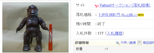 2009年11月~2011年10月までの過去2年間の調査の結果、1位のマルサンソフビ人形 ゴローは1,910,000 円と超高額落札されていることが分かりました。