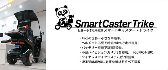株式会社キバンインターナショナルは、株式会社ローランドが2011年11月15日発表したビデオスイッチャーVR-3と、HONDA製ジャイロキャノピーを改造したミニカーをベース車として世界一小さな中継車を開発し、SmartCasterTRIKEと名付け、ここに発表します。