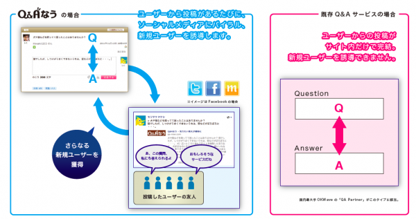 「Q&A なうASP」導入の最大のメリットは、FacebookやTwitterなどソーシャルメディアでアクティブに活動し、バイラル効果を生み出す発言力のあるユーザーたちを、御社のサイト内に簡単に取り込むことができる点です。