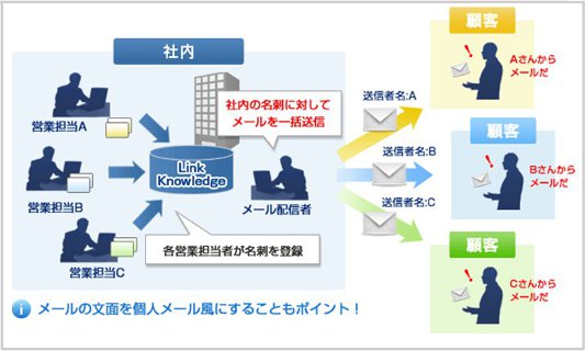『受注機会サイクルシステム』は、独自の「メール配信機能」によって、リンクナレッジに構築された“正確な名刺データベース”を顧客の収益最大化に活用することをコンセプトとしたサービスです。