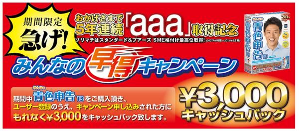 キャンペーン期間中、2011年11月25日(金)発売の最新版「みんなの青色申告13」をご購入いただき、ユーザー登録とキャンペーン申し込みをされた方に、もれなく3,000円をキャッシュバックいたします。