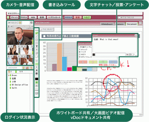カメラ/マイクを使った会話はもちろんのこと、ドキュメントの共有、ホワイトボードへの書き込み、等の充実の機能が搭載されています。