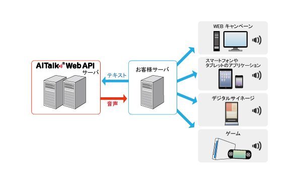 AITalk (R) Web APIは今までWebサービス等で音声合成エンジンを利用する場合に必要だった、Serverの構築をせずに、インターネットサービス等から、音声合成エンジンをSaaS型で利用できるサービスです。自社で音声合成用Serverを構築する手間が省けるため、Webサービスや、スマートフォンアプリケーション、ソーシャルゲーム等、様々なサービスで、もっと手軽に音声合成を利用したサービスを開始する事ができます。