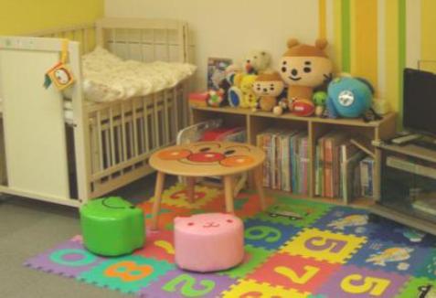 ベビーベッド、絵本、玩具を備え、DVDの視聴も可能なキッズスペースを設置