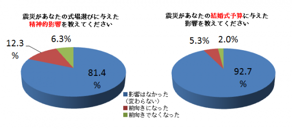 「Q.震災があなたの式場選びに与えた精神的影響を教えてください」という設問に関しては、「影響はなかった(変わらない)」が81.4%と大半を占め、「Q.震災があなたの結婚式予算に与えた影響を教えてください」という設問に関しては、「影響はなかった(変わらない)」が同じく92.7%と大半を占めました。