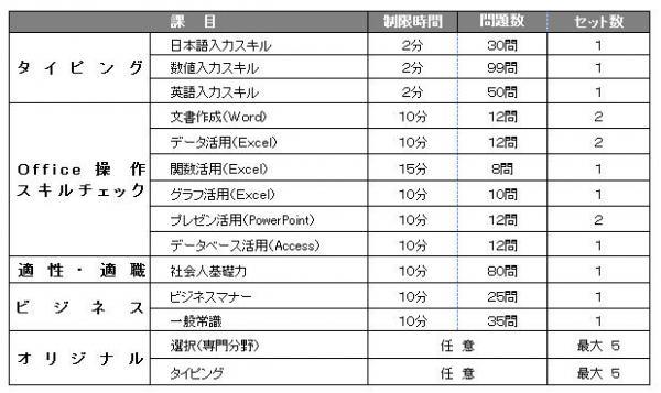 パソコンの基本的な入力スキルを、(1)「日本語入力スキル」と(2)「数値入力スキル」(3)「英語入力スキル」のテストで診断します。測定時間は各2分間。その間に入力された文字数(英文はワード数)と正確性でスキルレベルを診断します。また、問題文の変更はオプション機能にて可能です。