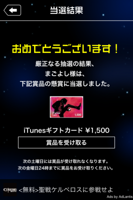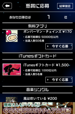 賞品は今のところ「有料アプリ」「iTunesギフトカード」「音楽アルバム」「音楽シングル」「映画」「ミュージックビデオ」の6種類があります。