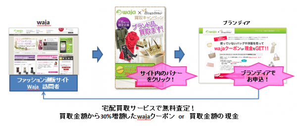約4,500以上の取り扱いブランド数を誇るブランド品宅配買取サービス「ブランディア」及び海外ブランド約5,000以上を取り扱うファッション通販サイト「waja」の両サービスの主な利用者層である消費意欲の高い30代から40代の女性に対して、「売って×買う」という流通の活性化とリユースへの取り組みを促進するため、今回のコラボレーション企画の実施に至りました。期 間:2011年12月1日(木)~2012年1月15日(日) 対象者:期間中に専用ページからお申込みを行い、wajaクーポンでの買取をご希望の方