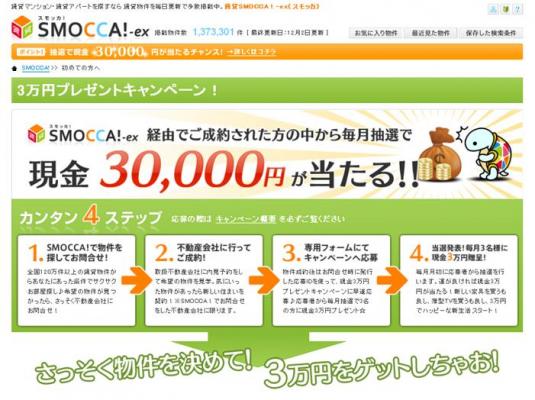 そこで、賃貸SMOCCA!-exを利用してお部屋を成約されたユーザーに対して抽選で現金3万円プレゼントキャンペーンを開始致しました。