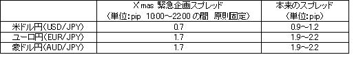 そして更に「X'mas 緊急企画」として、10:00~22:00の時間帯につきましては、ドル円を始めとする3通貨ペアにおきまして、以下の通りナローなスプレッドを原則固定(注)にて配信させていただきます。