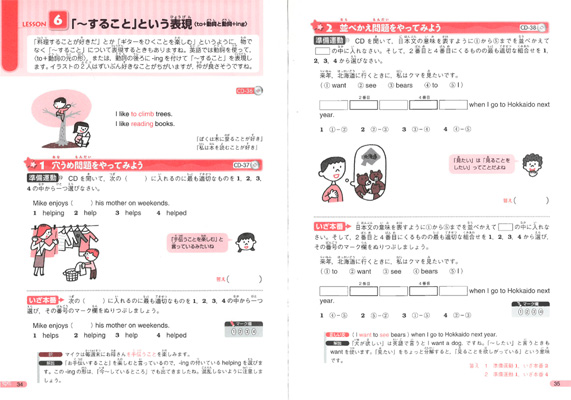 レッスンページでは、学習が楽しくなるようなかわいらしいイラストが満載です。また、5級ではリズムにのせて単語を覚えるページなどもあります。