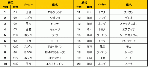 10月のランキングでは、9月より引き続いて1位に日産エルグランド、2位にスズキワゴンR、3位に日産セレナがそれぞれランクイン。この3台は、8月や7月にも上位にランクインしており、人気の高さが伺えます。 その他の動きを見てみると、全体的に人気が高いのはやはりミニバン。アルファードやステップワゴンなどは上位にランクインこそしていないものの、先月・先々月から引き続いて20位圏内にランクインしています。また、10位のエクストレイルは冬の需要のためか大きく順位を上げてきました。